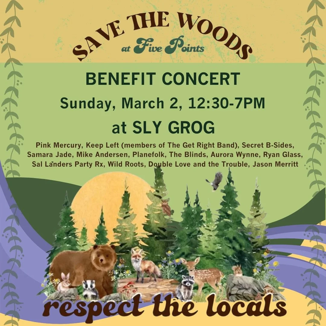 Concert to preserve the urban forest in the Five Points Neighborhood from potential development. Event from noon-7. Aurora is playing a solo acoustic set at 3PM. This cause is very aligned with our values. Please come support our wildlife habitats!